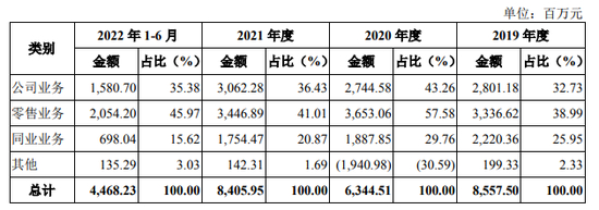 招股书显示,2019年至2022年上半年,顺德农商行的零售业务收入分别为33.37亿元、36.53亿元、34.47亿元及20.54亿元,在营收中的占比分别为38.99%、57.58%、41.01%、45.97%。
