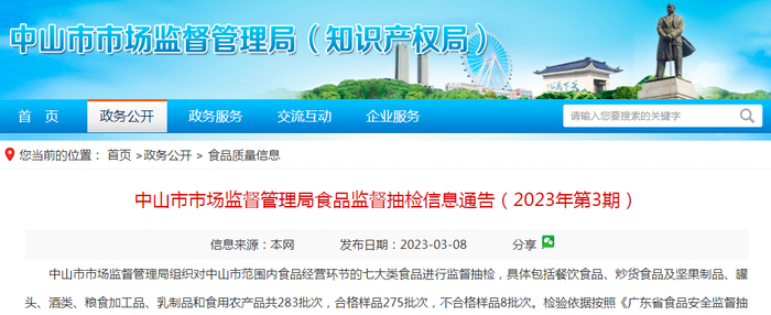 中国质量新闻网讯 2023年3月8日,广东省中山市市场监督管理局网站发布食品监督抽检信息通告(2023年第3期)。