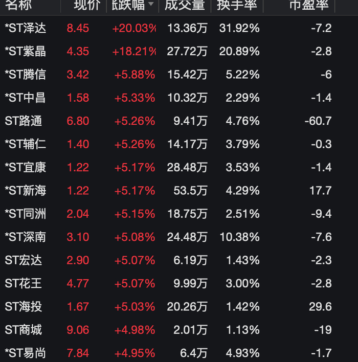 “近期是年报、一季报披露的时间,很多投资者会有赌性心理。假如一些披星戴帽的公司业绩改善了,那未来还有摘星摘帽的可能性,而且ST股价格低,股价很容易就被拉起来了。”某券商人士向记者表示,近期ST板块受到热炒无外乎两方面原因,一是业绩披露季,投资者“赌”业绩改善、摘星摘帽预期;二是相关公司有被收购重组的预期。