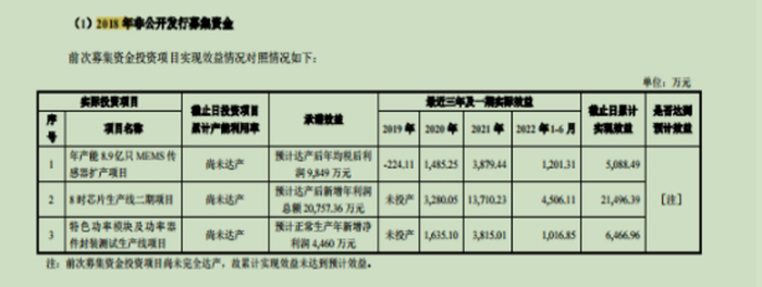 根据士兰微最新披露的前次募资使用情况报告,2018年,公司7.32亿元募资中,原计划是“3.06亿元投向年产能8.9亿只MEMS传感器扩产项目、3亿元用于8吋芯片生产线二期项目建设、1亿元用于特色功率模块及功率器件封装测试生产线项目建设”。