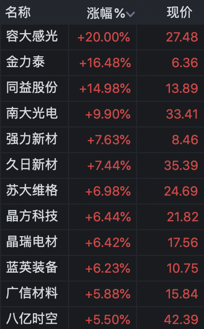 财联社3月8日讯(编辑 俞琪)光刻胶概念股午后异动拉升,容大感光收盘20cm涨停,金力泰和同益股份分别涨超16%和14%,南大光电涨近10%。
