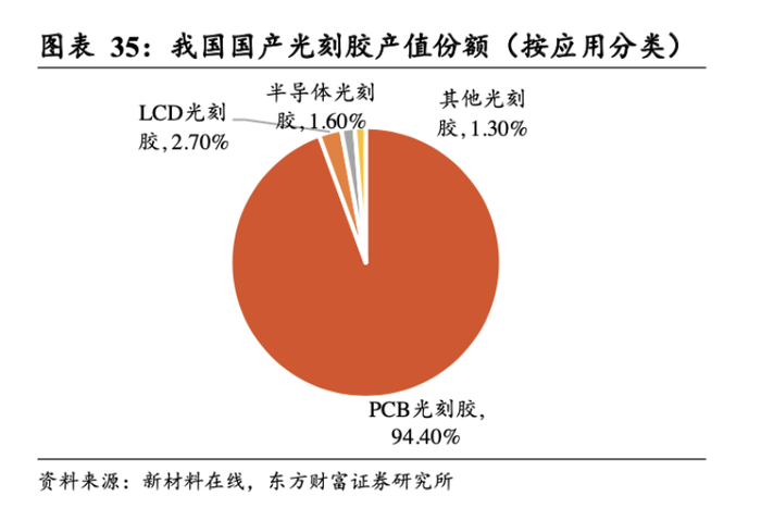 东方财富证券研报表示,日美企业厂商占据国内高端光刻胶市场大部分份额,其中G/I线国产化率10%,高端KrF、ArF国产化率不足5%。一旦断供,国内多家晶圆厂或将面临光刻胶缺货风险。因此材料端自主可控成为国际大趋势,光刻胶下游客户对供应链安全性的关注度大幅提升,将主动或被动的快速导入国产光刻胶,国内企业迎来高端光刻胶国产替代良机。