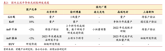 在研方面,南大光电ArF光刻胶已通过客户验证,有少量发货;北京科华与中科院联合承担的国家02专项EUV光刻胶项目已通过国家验收。近日南大光电表示,公司正抓紧ArF光刻胶产品认证和市场拓展工作,争取尽早实现量产。