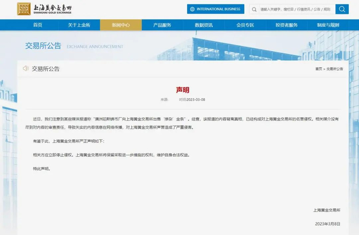 3月8日午后,上海黄金交易所(SGE)对“澳洲珀斯铸币厂向上海黄金交易所出售‘掺杂’金条”的相关报道作出正面回应,表示内容背离真相,已构成对上海黄金交易所的名誉侵权。