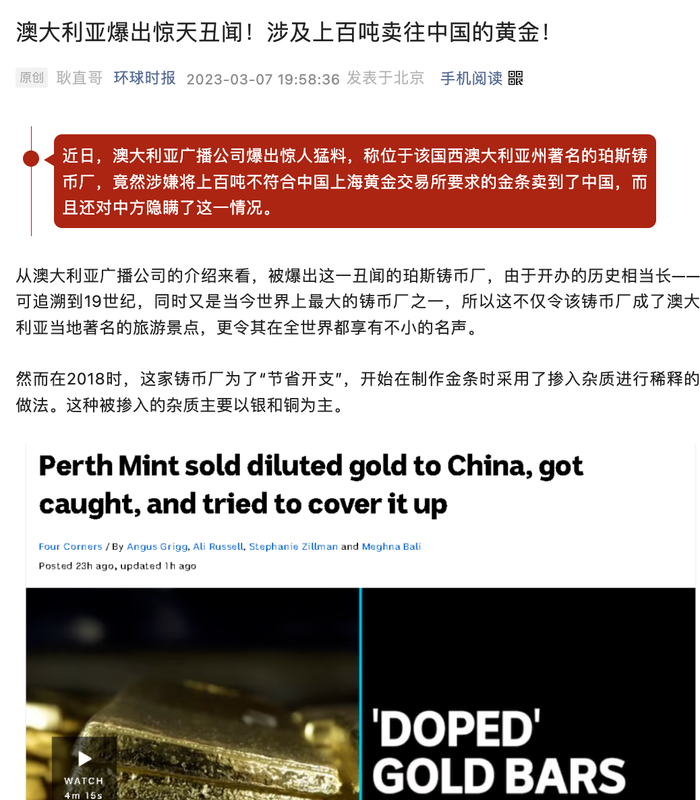 据环球时报3月7日报道,近日,澳大利亚广播公司爆出惊人猛料,称位于该国西澳大利亚州著名的珀斯铸币厂,2018年开始为了“节省开支”,在制作金条时掺入杂质进行稀释,还涉嫌将上百吨这样不符合上金所要求的金条卖到了中国,并且对中方隐瞒了这一情况。