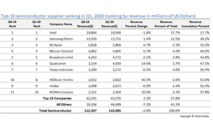 图3所示为Omdia发布的2020年第一季度全球前十大芯片厂商的营收和排名情况。