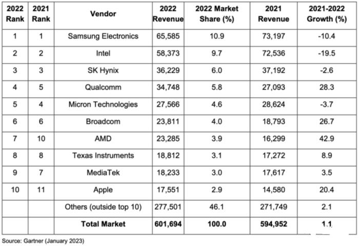 然而,2020年以后,英特尔遭遇了以AMD为代表的友商强有力的竞争,主营的CPU业务大幅下滑,特别是2022年,该公司营收仅为583.73 亿美元,同比大跌19.5%。在这种情况下,虽然2022年的存储芯片市场一路下滑,对三星电子的营收造成了严重影响,从2021年的731.97亿美元下降至655.85亿美元,但由于竞争对手英特尔的表现过于拉胯,使得三星依然稳坐在了头把交椅上。