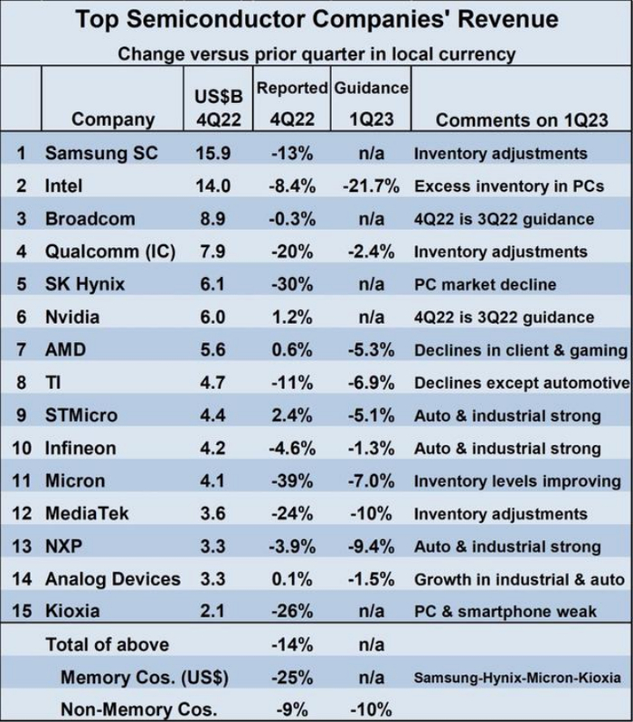 近期,WSTS发布了2022年第四季度全球营收排名前15位的芯片厂商榜单,如图1所示。