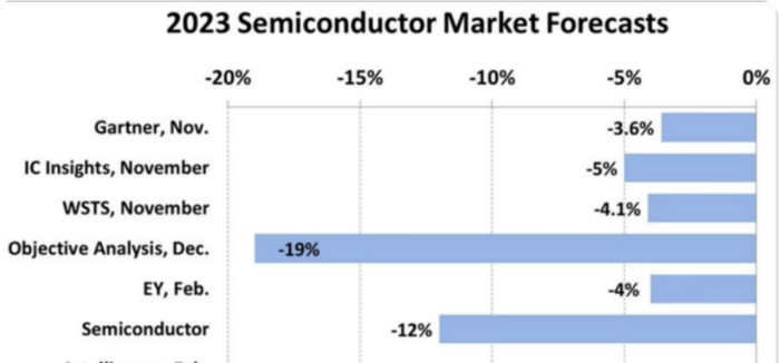 对于2023全年走向,各大机构都给出了预测数据,如图6所示。Gartner、IC Insights、WSTS和EY预计下降幅度在4%-5%之间,Objective Analysis预计2023年将下降19%,Semiconductor Intelligence预测2023年将下降12%。