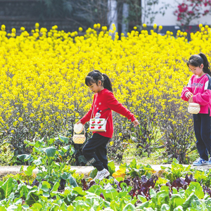 3月5日,在四川省崇州市道明镇,小朋友在油菜花田中玩耍 新华社图