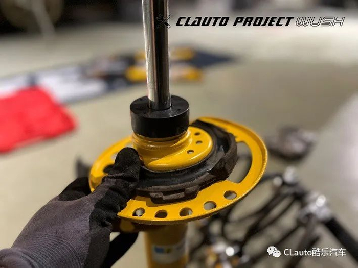 我们可以看到Bilstein B6的桶身直径明显比原厂的更大。将塔顶,限位缓冲胶和防尘套都安装在新的B6减震器上。