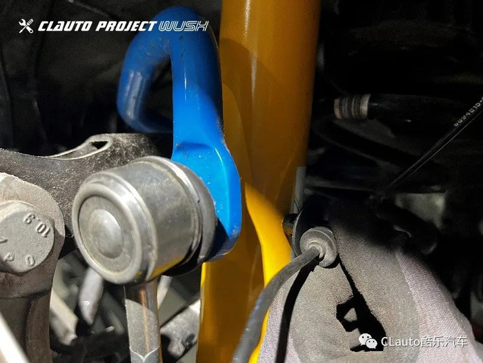 13 将减震器安装回羊角上之后,确认是否方向正确且安装到位。此时取下羊角分离器,并将带有轮速传感器线束的支架卡回原位。之后将螺栓螺母安装好,减震器底部就固定好了。