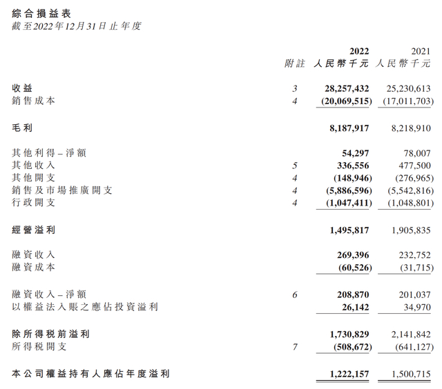 尽管统一在2022年录得收入增长了12%,但销售成本也水涨船高,从2021年的约170亿元增至去年的200亿元,同比增长了约17%。
