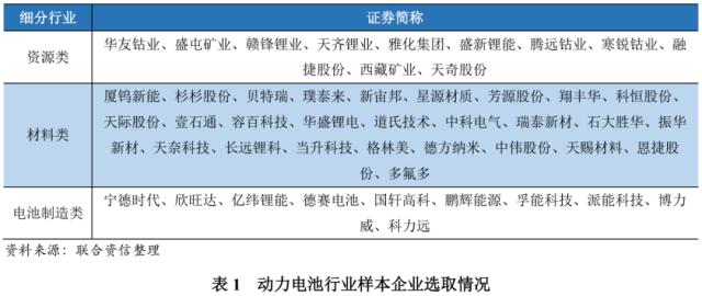 为便于信息获取和数据对比,联合资信选取了动力电池产业链中资源、材料、电池制造三个环节共48家上市公司作为样本企业。
