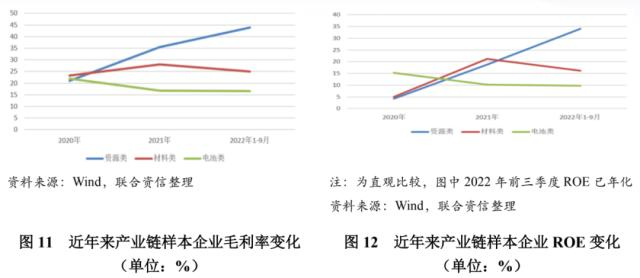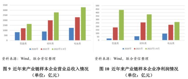 收入和利润方面,2021年,资源类、材料类、电池制造类样本企业营业收入总和同比增幅分别为46.92%、124.01%和86.04%,净利润总和同比增幅分别为633.18%、352.15%和132.37%。2022年1-9月,资源类、材料类、电池制造类样本企业营业收入总和分别为1629.26亿元、2779.01亿元和3285.21亿元,同比增幅分别为73.61%、105.50%和104.27%;净利润总和分别为439.78亿元、374.58亿元和263.83亿元,同比增幅分别为475.84%、195.29%和76.60%。