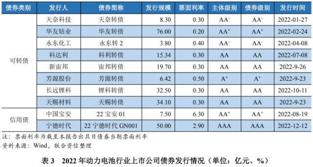 2022年,动力电池行业上市公司中共有10家企业发行共10期债券,发行金额合计253.66亿元。其中,可转债8期,发行人分别为华友钴业、天奈科技、科达利、永东化工、新宙邦、芳源股份、长远锂科和天赐材料,发行额度合计196.16亿元;信用债2只,发行人分别为中国宝安和宁德时代,发行额度合计57.50亿元。新发行可转债信用等级最低为A+,票面利率最高为0.50%;新发2期信用债的信用等级分别为AA+和AAA,票面利率相差较大。