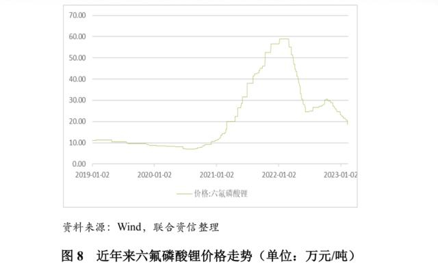 锂电池电解液的价格与六氟磷酸锂的价格高度相关。2020年下半年及2021年,动力电池对电解液的需求快速增长,但因环保政策限制产能建设、新冠肺炎疫情扰动生产,六氟磷酸锂供不应求、价格持续上涨;2022年1-2月,六氟磷酸锂价格在59.0万元左右,较2021年初上涨约4.2倍,总体处于历史最高水平。自2022年3月起,因前期产能逐步释放、供应有所恢复,六氟磷酸锂价格明显回落,截至2022年底,六氟磷酸锂价格已降至23.25万元左右,较2月份的最高价下降超过60%,但从均价水平看,2022年,六氟磷酸锂均价为35.69万元/吨,仍略高于2021年34.83万元/吨的水平。2023年1月,六氟磷酸锂价格持续回落,截至1月底,价格已降至20.75万元左右。