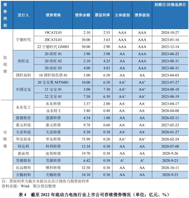 截至2022年底,动力电池上市公司存续信用债券中,于2023年到期(或面临回售)的信用债券共6期、55亿元,其余4期债券(共62.60亿元)到期日分布于2024年8月至2025年12月之间;存续的11期可转债中,有一期(永东转债)于2023年4月到期,其余可转债到期日主要集中于2028年。动力电池行业存续债券中,可转债占比大,信用债到期(或回售)时间较集中于2023年,但债券总规模不大,债券集中偿付压力较小。