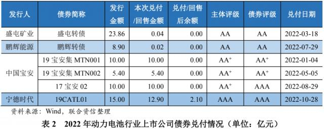 2022年,动力电池行业中共有4家企业的6期债券到期或提前赎回,兑付本金合计38.36亿元,未出现违约或延迟兑付的情况。具体情况如下表所示。