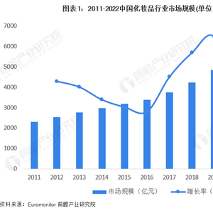 伴随我国经济的不断发展,居民收入水平的不断提高,在欧美及日韩大牌化妆品公司对中国市场的开拓下,国内消费者的化妆品消费理念逐步增强,国内化妆品市场规模迅速扩大。据Euromonitor统计数据,2011-2022年我国化妆品的市场规模呈现逐年递增的趋势,但2011-2019年市场规模增长率呈现先下降后上升趋势。我国市场规模从2011年的2309.44亿元增长到了2022年的6164.33亿元,复合增长率约为9.3%。
