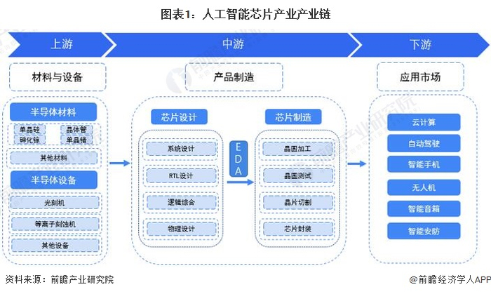 人工智能芯片产业链主要分为上游的材料与设备,中游的产品制造,下游的应用市场;上游的材料与设备主要指半导体材料和半导体设备,半导体材料包括单晶硅、单晶锗、砷化镓、晶体管等材料,半导体设备包括光刻机、等离子刻蚀机等设备;中游的产品制造包括芯片设计和芯片制造,芯片设计的流程主要是通过EDA进行系统设计、RTL设计、物理设计等过程,芯片制造包括晶圆加工、晶圆测试、晶片切割、芯片封装等过程;下游的应用市场主要有云计算、自动驾驶、智能手机、无人机、智能音箱、智能安防等。