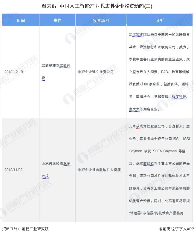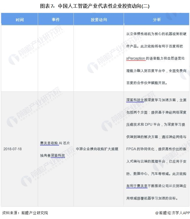 2018年以来,人工智能芯片产业代表性企业的投资动向主要包括收购公司拓展业务、通过对子公司增资的方式投资芯片设计研发项目。人工智能产业代表性企业最新投资动向如下: