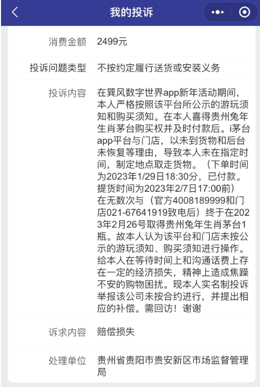 酒业内参又联系到另一位遭遇同样情况的消费者,该消费者表示,自己严格按照巽风APP所公示的游玩须知和购买须知。获得购买资格并及时付款后,i茅台app平台与门店以未到货物和后台未恢复等理由,导致其未在指定时间、指定地点取走货物。给自己在等待时间上和沟通话费上存在一定的经济损失,精神上造成焦躁不安的购物困扰。目前已向贵州省贵阳市贵安新区市场监督管理局投诉。