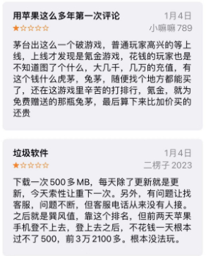 “只投入时间还不够,不充钱排名根本靠不了前”有年轻玩家表示。“普通玩家你就不要想登榜排名了,你不充钱怎么可能让你拿到资格?”有玩家在巽风贴吧里表示自己充值了5000元,排名才冲到1500名,仍未拿到购酒资格。还有玩家在应用商店评论,普通玩家高兴的等上线,上线才发现是氯金游戏,花钱的玩家也是不知道图什么,大几千,几万的充值,有这个钱什么虎茅,兔茅,随便找个地方都能买了,还在这游戏里辛苦的打排行,氯金,就为免费赠送的那瓶兔茅,最后算下来比加价买的还贵。