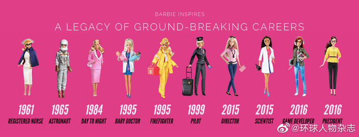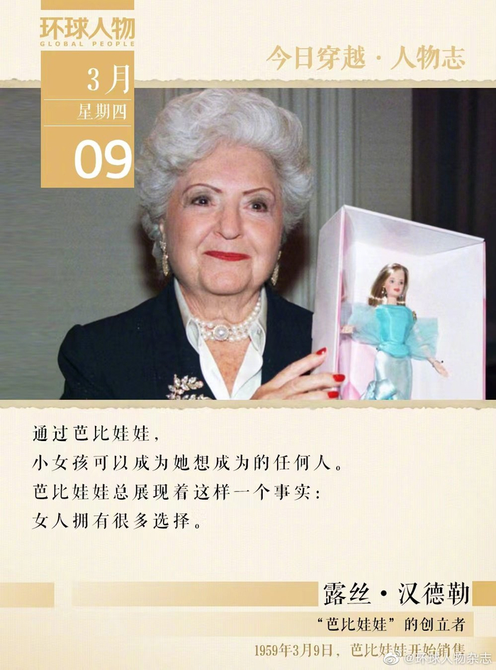 1959年3月9日,芭比娃娃开始销售。芭比娃娃最初由美泰公司联合创始人露丝•汉德勒发明,她的灵感来自于她的女儿,Barbie正是她女儿名字Barbara的小名。她发现女儿Barbara的玩具仅限于各种洋娃娃,只能想象自己将来成为一个母亲,但她的儿子却能想象自己将来从事各种各样的职业。芭比娃娃旨在向年轻女孩表明,她们也可以拥有大大的梦想。目前,芭比娃娃已经拥有了200多种职业身份。从外科医生、宇航员再到总统和机器人工程师,芭比娃娃不断打破人们的刻板印象,扮演了越来越多传统上属于男性的职业角色。