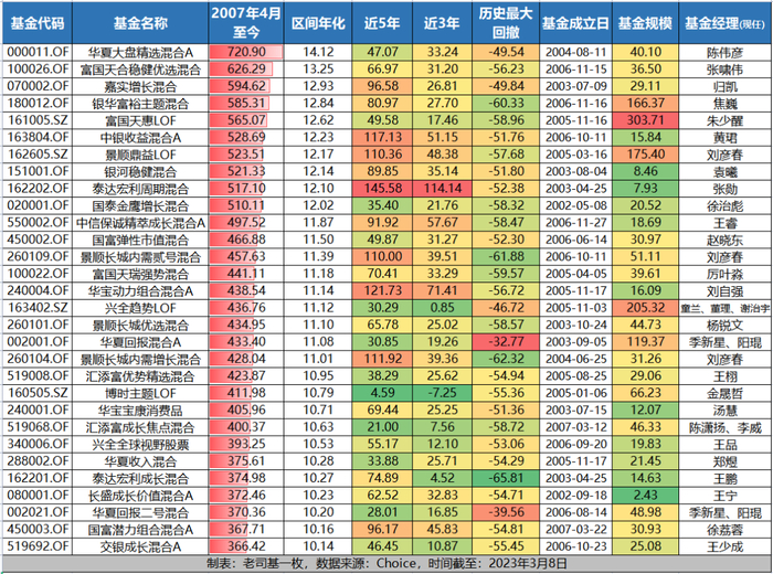 数据显示,从2007年4月至今,收益率最高的主动权益基金为华夏大盘精选混合A(000011),区间总回报高达720.9%,长期年化达14%,高居榜首。另外,富国天合稳健优选混合(100026)的区间总收益超过6倍,达到626.29%,位居第二名;归凯管理嘉实增长混合(070002)、焦巍管理的银华富裕主题混合(180012)、朱少醒管理的富国天惠(161005)等基金的累计总回报均超过5倍,位居涨幅榜前列。