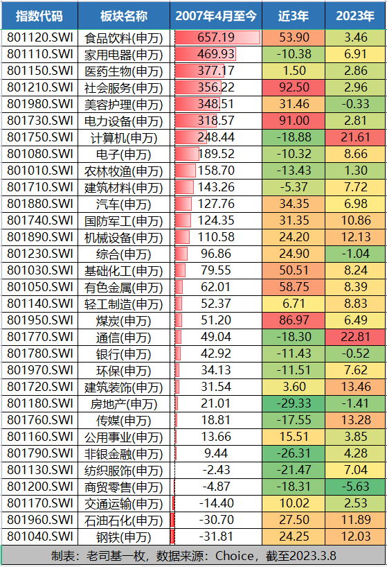 近16年来涨幅垫底的板块,分别为钢铁、石油石化和交通运输板块。其中,钢铁板块以31.81%的累计跌幅位居榜尾,与榜首的食品饮料板块的差值高达689%!这充分说明,选择好行业赛道,对于我们长期投资来说,是多么重要。