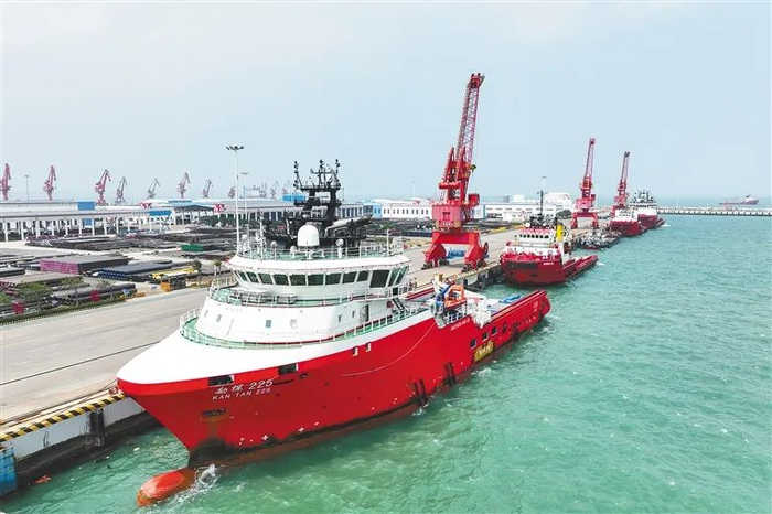 近日,在海南中海石油码头有限公司码头,货船正在进行补给作业。目前有34家石油相关企业委托码头提供后勤支持服务。海南日报记者 武威 摄