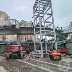 该工程为平面呈带倒角的四边形的天桥,全长191.96米,总宽5米,全桥共8跨,设置四部直升电梯。目前,该工程已完成钢箱梁吊装及梯道安装,预计今年7月完工。
