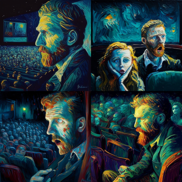 5. 梵高参观了一家电影院,用他标志性的旋转笔触和鲜艳的色调创作了一幅人们观看恐怖电影的俏皮画面。