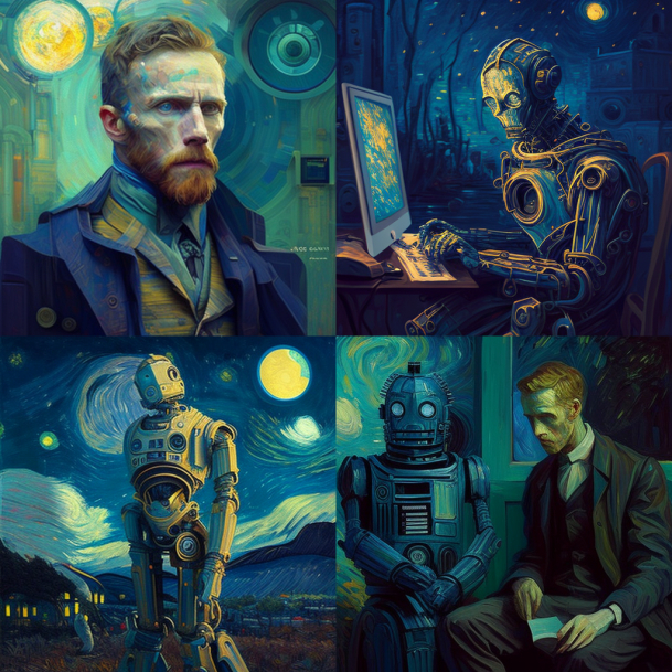 整体尝试下来,我们能明显看到MJ的一些长处:插画的完整性和艺术性都比较高,对于梵高人物特征的把握也比较好,能巧妙地融合输入的关键词和人物特色等。