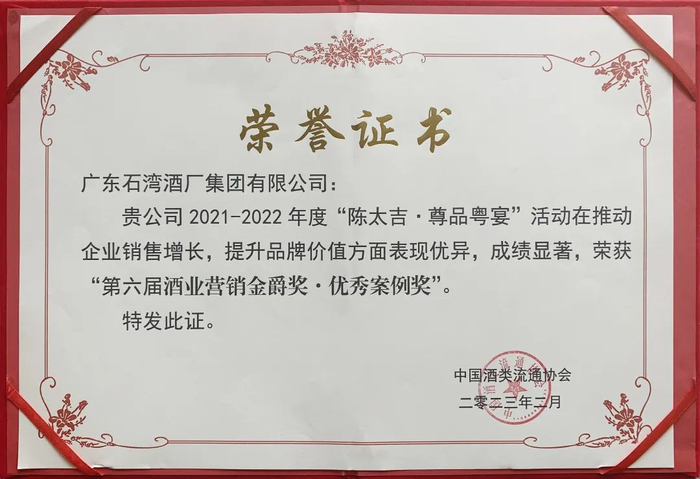 2月22日-23日,在第六届中国酒业营销金爵奖、第3届酒业青云奖颁奖礼上,石湾酒厂集团喜讯频传,公司“陈太吉·尊品粤宴”荣获“金爵奖·优秀案例奖”,“石湾酒”和“石湾玉冰烧·琥珀小酒”分别摘取青云奖“年度高端产品”“年度十大光瓶酒”桂冠。