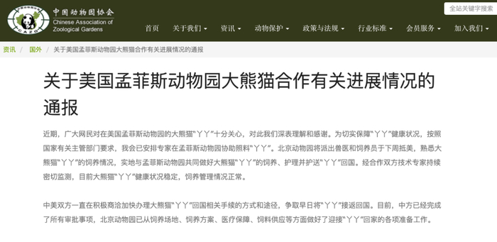 3月8日,中国动物园协会发布关于美国孟菲斯动物园大熊猫合作有关进展情况的通报。