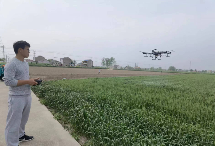三月春耕忙,江苏省宝应县柳堡镇新安村的麦田里,四五台无人机正在升空,随着均匀的喷洒,几十亩小麦的除草工作很快搞定,效率达到人工操作的20倍。田埂上急匆匆走来的“95后”王雨森和他的无人机小分队,正要按预约赶往下一家种粮大户。