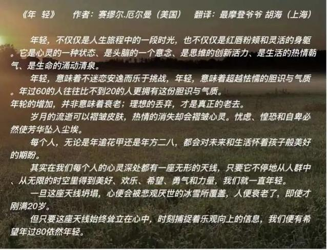 我非常欣赏一首英文诗歌《Youth》,并且自己翻译过全文。“年轻不仅是人生旅程中的一段时光,更是心灵的一种状态、头脑的一个意念、生活的热情朝气、生命的涌动清泉。”只要姿态、神态、心态都保持年轻,不断学习新事物,就能越老越稀奇。