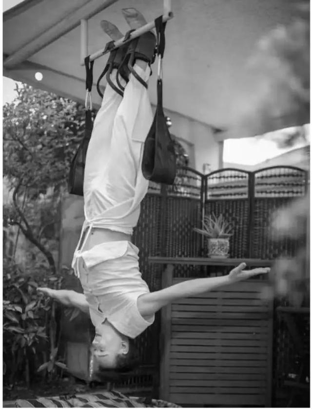 瑜伽结束后,我会再练一段肚皮舞。我习惯每天睡午觉,时间不能太长但必须睡着。午睡醒来后录制全民k歌,唱喜欢的歌。晚上一般看看电视、新闻,十点前一定睡,我觉得熬夜是很糟糕的事情。除此之外,我还有独门的健康秘诀——倒挂,为此我还买了专业的电动设备。