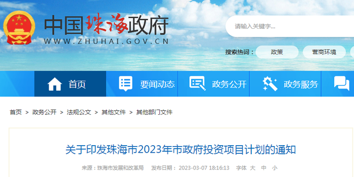 珠海市2023年市政府投资项目计划