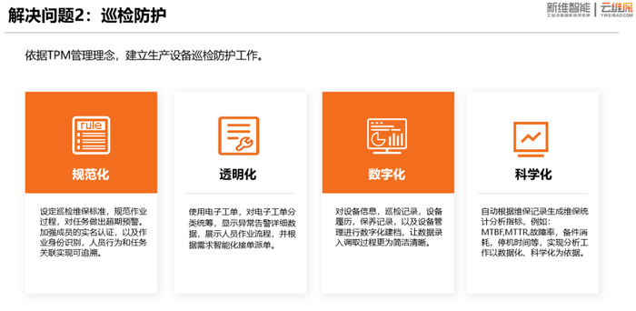 (2)进一步完善设备的管理体系和管理制度,做好最基础的各项工作,要保证设备原始记录的采集真实、及时、准确、详细,并组织设备管理人员使用新一代信息技术,借助云维保 工厂维保管理SaaS服务软件系统为每台生产设备建立一机一码的资产电子化管理体系,实现设备的贴码建档上系统,实时做好设备日常巡检与维保的日志数据记录,实现设备上云上平台的数字化转型升级。