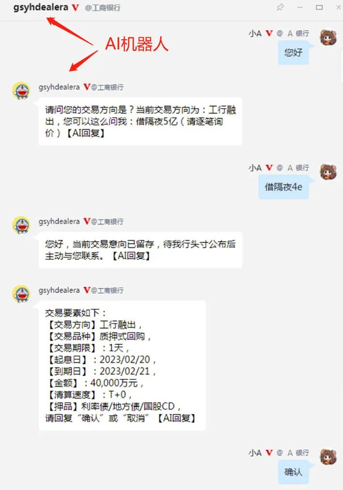 “从目前应用方向看,AI机器人正在取代部分交易员的工作,其中,询价操作是一个典型应用。在人工定义回复逻辑后,可以自行回复询价,达成交易。这种操作基于目前货币市场交易相对结构品种简单的环境,因此替代性较强。”一位国有大行相关负责人向记者表示。