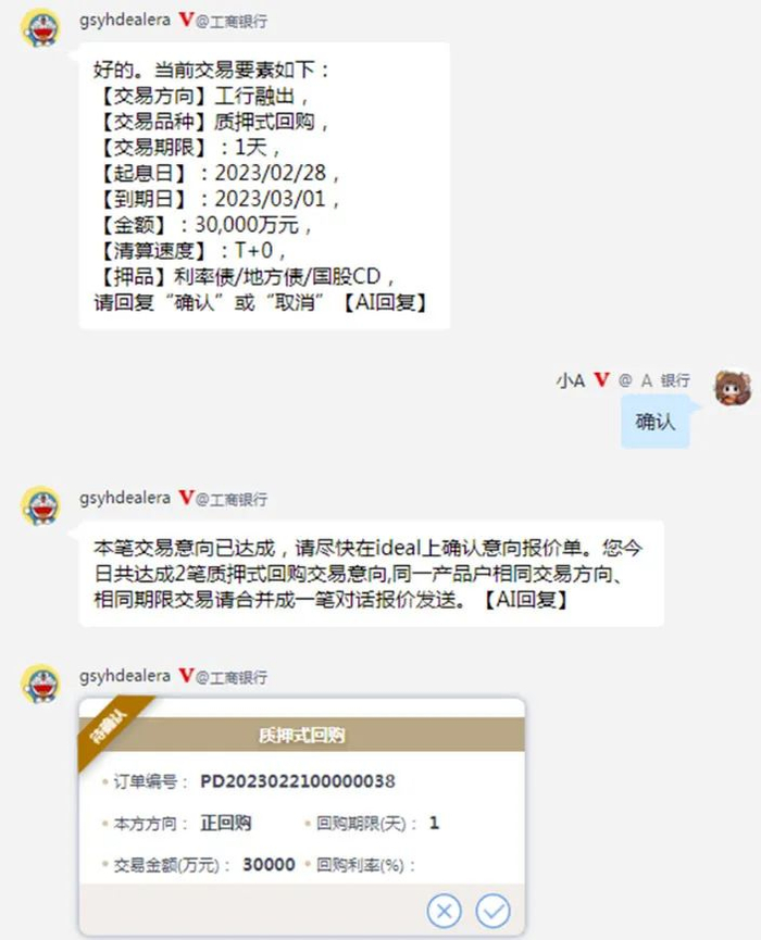 例如:AI交易机器人可早于交易员的上班时间开始一天的工作,将某市场机构交易员“小A”的融资需求记录下来。待融资计划确定后,如满足“小A”的需求,AI交易机器人将主动向“小A”推送意向报价单,“小A”确认后即可成功达成交易意向。