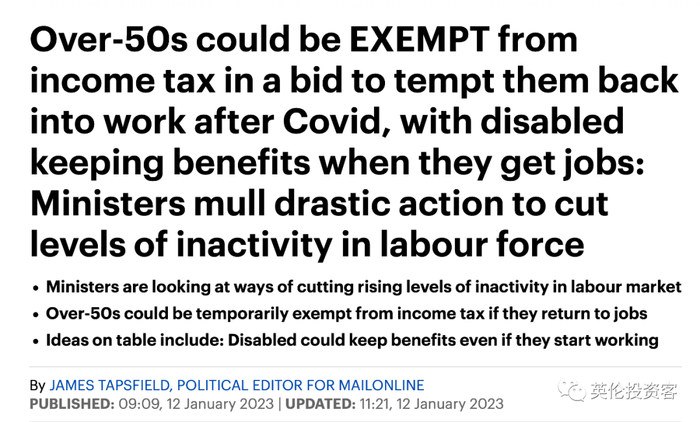 比如,英国政府计划加重返工作岗位的人的免税额,例如50岁以上的重返工作者可以在最多一年的时间里免征个人所得税
