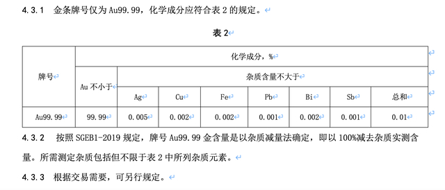 澎湃新闻记者查阅国家标准化管理委员会公布的GB/T 4134-2021金锭标准,其中显示,品级为一级的黄金纯度必须达到99.99%,同时其银的含量不能超过0.005%,铜不能超过0.002%,所有杂质成分总量不能超过0.01%。