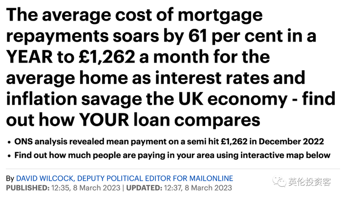英国国家统计局数字显示,随着利率和通货膨胀的高企,英国房产平均还贷额在一年内飙升61%。