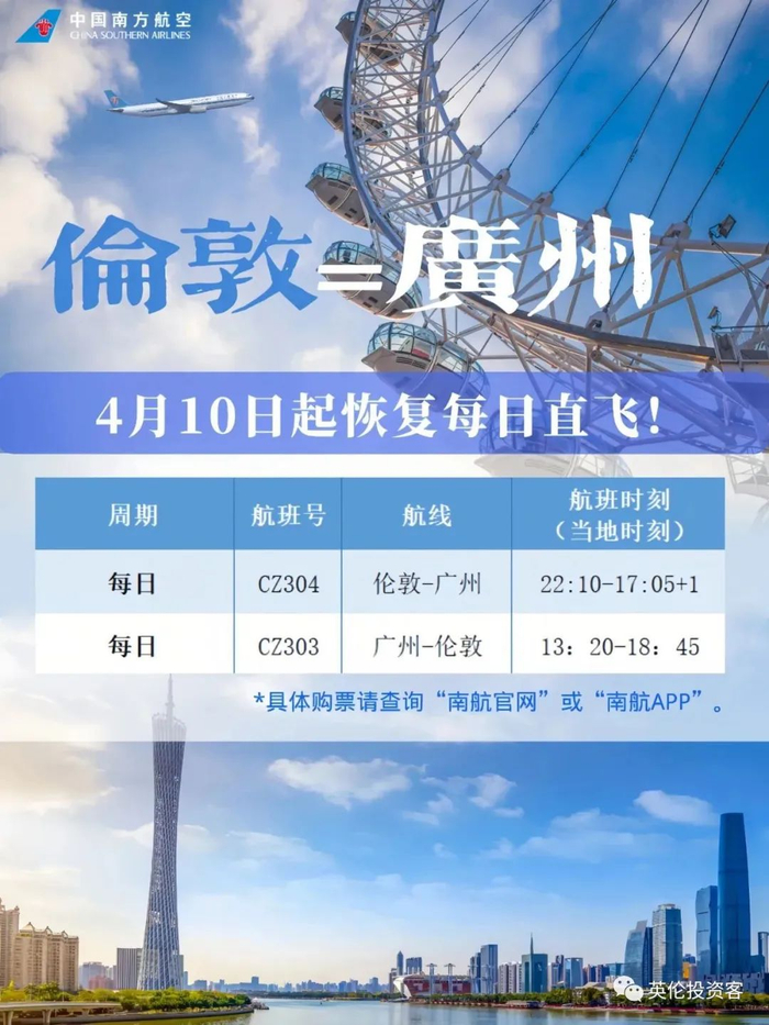 4月10日起,每天1班伦敦-广州直航。
