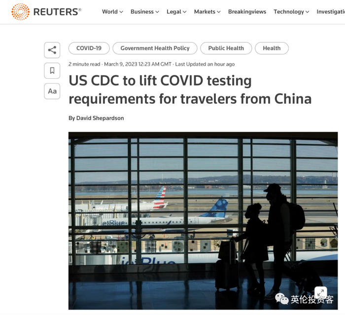 ● 美国韩国等国将放宽对中国旅客的新冠检测要求,英国暂未跟进