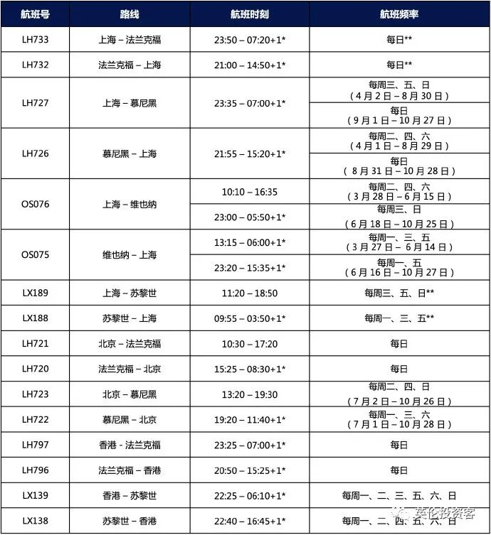 汉莎航空在其官微公布了夏季航班时刻表,包含2023年3月26日至2023年10月28日的航班信息,具体如下: